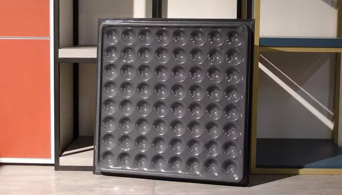 تایل فولادی معمولاً با روش پرس و قالبگیری تولید میشود و بسته به نوع پروژه، ساختار داخلی آن بهصورت توپر یا توخالی طراحی میگردد. ابعاد استاندارد پنلها ۶۰ در ۶۰ سانتیمتر است و ضخامت آنها بین ۳۲ تا ۳۵ میلیمتر قرار میگیرد. ورق مورد استفاده معمولاً فولاد ST12 یا گالوانیزه است و پایهها امکان تنظیم ارتفاع از ۱۰ تا ۱۰۰ سانتیمتر دارند. تحمل بار نیز بسته به مدل بین ۱۰۰۰ تا ۳۰۰۰ کیلوگرم محاسبه میشود. روی این تایلها میتوان انواع روکشها مانند HPL، PVC، موکت، لمینت یا سرامیک نصب کرد.